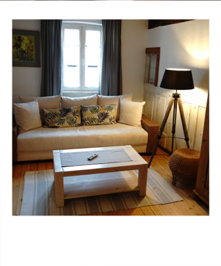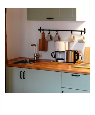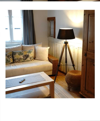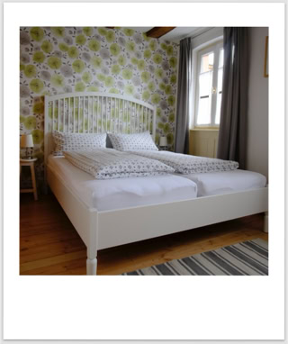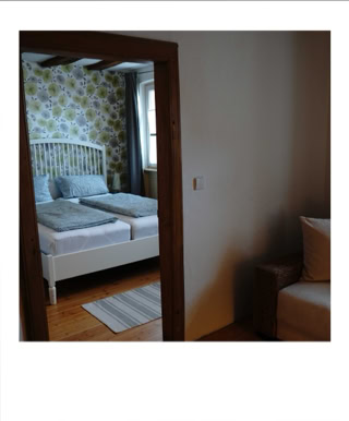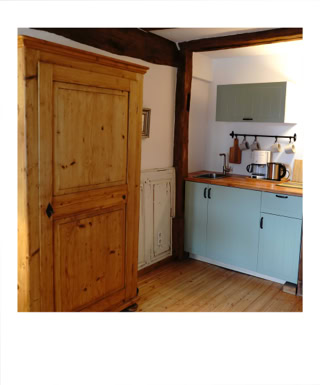 und ist 26 qm groß. Sie bestehtaus einem Wohnzimmer mit Essecke und Küchenzeile, einem Schlafzimmer und einem Bad mit Dusche und WC.Der Dielenboden, freigelegtes Fachwerk und Holzpanele im Wohnzimmer geben den Räumen ihren ganz eigenen Charme. Die kleine Küche ist mit einem Zweiplattenherd, Kühlschrank und einer Basisausrüstung zum Kochen kleiner Gerichte ausgestattet. Das Sofa im Wohnzimmer kann gegebenenfalls zu einem Schlafsofa umfunktioniert werden.