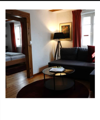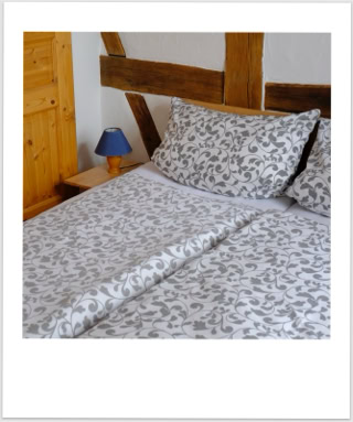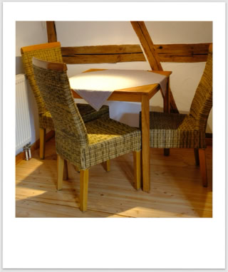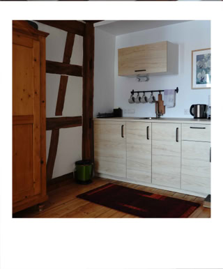 Unsere Wohnung Nr. 2 liegt im ersten Stock. Sie ist baugleich wie Wohnung Nr 1., hat ein Wohnzimmer mit Essecke und Küchenzeile, ein Schlafzimmer und ein Bad mit Dusche und WC. Auch hier sind der Dielenboden, freigelegtes Fachwerk und Holzpanele prägend für den Charakter der Wohnung. Es gibt eine Küchenzeile mit Zweiplattenherd und Grundausstattung fürs Kochen. Das Sofa im Wohnzimmer ist ausziehbar.