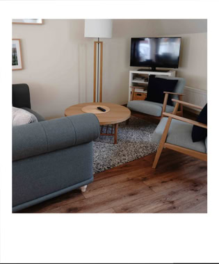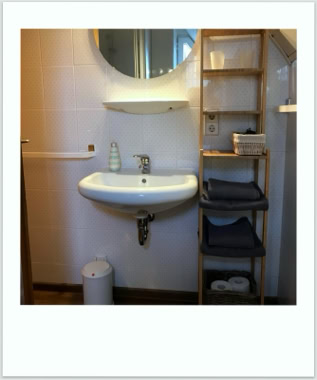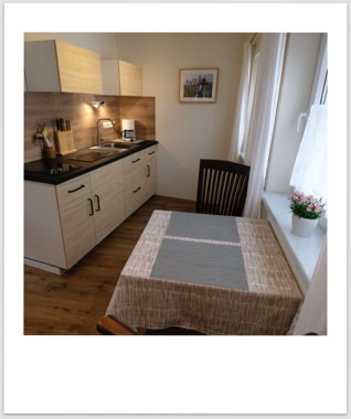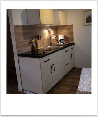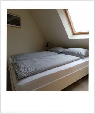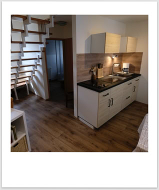 Die Nr. 7 ist mit ca 60qm die größte unserer Wohnungen. Sie liegt im ersten Stock und hat einen geräumigen Wohn-Eß-Bereich. Von dort geht es über eine Treppe in zwei kleine Schlafzimmer. Eines mit Doppelbett, das andere mit zwei Einzelbetten. Das Bad mit Dusche und WC befindet sich auf der Ebene des Wohnzimmers. Die Küche der Nr. 7 hat einen Zweiplattenherd und einen Backofen